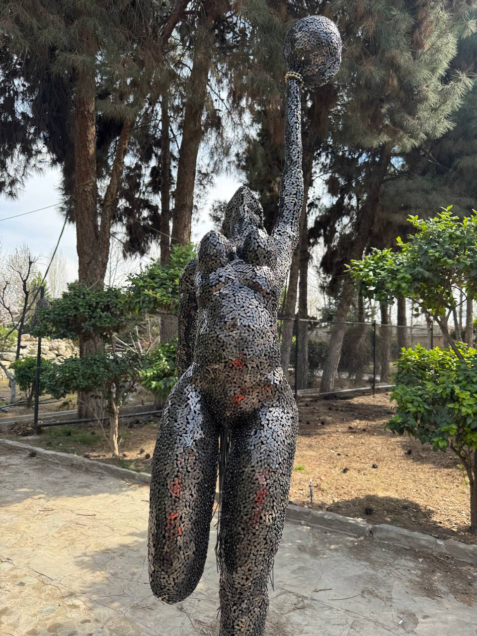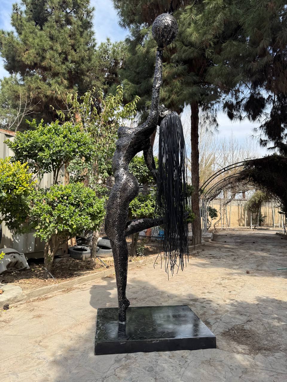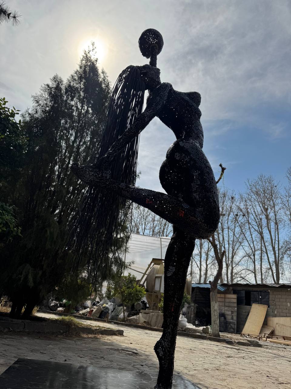 Gefertigt aus unzähligen Metallstücken, zieht sich die rohe Textur wie ein Netz über den Körper und erzeugt im Lichtspiel faszinierende Kontraste. Ihr Haar, lang und frei hängend, besteht aus Metallstreifen und verleiht dem Werk eine fast tänzerische Bewegung.